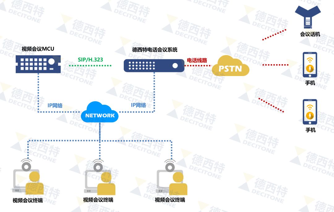 电话会议使用电话参加会议,无论是什么类型的电话,只要是电话都可以用来参加电话会议,并且这些电话终端具有统一的标准,具有一定的通用性。你可以使用手机、固定电话、会议话机、IP话机、卫星电话参加电话会议。电话会议使用号码进行寻址标记,电话号码是全球电信运营商认可的标准,无论你在哪个国家,只要你要电话号码,在全球范围内都可以找到你。这一点视频会议是做不到的。电话会议组织非常迅速,一分钟内可以召集近百人参加的电话会议,并且 电话会议的召开限制非常少,不依赖会议室设备,可以在任何地点和位置召开,节省会议室资源提升电话会议沟通效率。在企业内部部署德西特电话会议系统,与视频会议MCU对接。实现视频会议与电话会议的互通和备份。在日常应用中,视频会议与电话会议各自独立使用,互不干扰。提高工作沟通效率。当视频会议召开时,有部分人员需要通过电话接入时,会议会议室与电话会议室进行语音互联。电话会议用户与视频会议用户的语音互通。